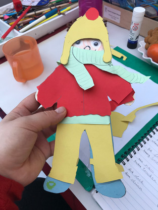 We make a little puppet out of cardboard (see picture) and we make him/her clothes out of colourful paper and while doing so we practice the names of the clothes we are making adding the names of the colours to them. “This is a blue jumper; these are yellow boots” etc.